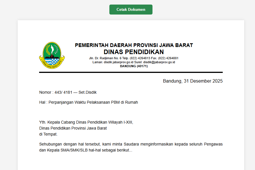 1 2 3 4 5 6 7 8 9 10 11 12 13 14 15 16 17 18 19 20 21 22 23 24 25 26 27 28 29 30 31 32 33 34 35 36 37 38 39 40 41 42 43 44 45 46 47 48 49 50 51 52 53 54 55 56 57 58 59 60 61 62 63 64 65 66 67 68 69 70 71 72 73 74 75 76 77 78 79 80 81 82 83 84 85 86 87 88 89 90 91 92 93 94 95 96 97 98 99 100 101 102 103 104 105 106 107 108 109 110 111 112 113 114 115 116 117 118 119 120 121 122 123 124 125 126 127 128 129 130 131 132 133 134 135 136 137 138 139 140 141 142 143 144 145 146 147 148 149 150 151 152 153 154 155 156 157 158 159 160 161 162 163 164 165 166 167 168 169 170 171 172 173 174 175 176 177 178 179 180 181 182 183 184 185 186 187 188 189 190 191 192 193 194 195 196 197 198 199 200 201 202 203 204 205 206 207 208 209 210 211 212 213 214 215 216 217 218 219 220 221 222 | <!DOCTYPE html> <html lang="id"> <head> <meta charset="UTF-8"> <meta name="viewport" content="width=device-width, initial-scale=1.0"> <title>Kop Surat & Tanda Tangan Digital - Disdik Jabar</title> <style> body { font-family: Arial, Helvetica, sans-serif; background-color: #f4f4f4; margin: 0; padding: 20px; display: flex; flex-direction: column; align-items: center; } /* Container Kertas A4 */ .paper { width: 210mm; min-height: 297mm; padding: 20mm; background-color: white; box-shadow: 0 0 10px rgba(0, 0, 0, 0.1); box-sizing: border-box; position: relative; } /* Kop Surat */ .header-container { display: flex; align-items: center; border-bottom: 4px solid #000; padding-bottom: 10px; margin-bottom: 20px; } .logo { width: 90px; height: auto; margin-right: 20px; } .header-text { flex: 1; text-align: center; margin-right: 90px; } .header-text h1 { font-size: 18px; margin: 0; text-transform: uppercase; } .header-text h2 { font-size: 22px; margin: 0; text-transform: uppercase; } .header-text p { font-size: 11px; margin: 2px 0; } /* Konten Surat */ .content { font-size: 14px; line-height: 1.5; text-align: justify; } /* Area Tanda Tangan */ .signature-wrapper { float: right; margin-top: 50px; width: 300px; position: relative; /* Penting untuk posisi stempel */ text-align: left; } .signature-title { margin-bottom: 10px; } /* Container untuk Tanda Tangan & Stempel */ .signature-space { position: relative; height: 120px; margin-bottom: 5px; } /* Gaya Stempel (Overlay) */ .official-stamp { position: absolute; width: 150px; /* Sesuaikan ukuran stempel */ left: -40px; /* Menggeser stempel ke kiri agar menimpa tanda tangan */ top: -10px; opacity: 0.8; /* Transparansi agar tanda tangan di bawahnya terlihat */ z-index: 2; } /* Gaya Tanda Tangan */ .signature-img { position: absolute; width: 180px; left: 20px; top: 10px; z-index: 1; } .signer-name { font-weight: bold; text-decoration: underline; margin-bottom: 0; } /* Tombol Cetak */ .no-print { margin-bottom: 20px; } .btn-print { padding: 10px 25px; background-color: #2d8a4e; color: white; border: none; border-radius: 5px; cursor: pointer; font-weight: bold; } @media print { body { background: none; padding: 0; } .paper { box-shadow: none; width: 100%; margin: 0; } .no-print { display: none; } * { -webkit-print-color-adjust: exact; print-color-adjust: exact; } } </style> </head> <body> <div class="no-print"> <button class="btn-print" onclick="window.print()">Cetak Dokumen</button> </div> <div class="paper"> <div class="header-container"> <img src="https://upload.wikimedia.org/wikipedia/commons/thumb/9/99/Coat_of_arms_of_West_Java.svg/330px-Coat_of_arms_of_West_Java.svg.png" alt="Logo Jabar" class="logo"> <div class="header-text"> <h1>Pemerintah Daerah Provinsi Jawa Barat</h1> <h2>Dinas Pendidikan</h2> <p>Jln. Dr. Radjiman No. 6 Telp. (022) 4264813 Fax. (022) 4264881</p> <p>Laman: disdik.jabarprov.go.id Surel: disdik@jabarprov.go.id</p> <p><strong>BANDUNG (40171)</strong></p> </div> </div> <div style="text-align: right; margin-bottom: 20px;">Bandung, 31 Desember 2025</div> <div class="content"> <p>Nomor : 443/ 4181 — Set.Disdik</p> <p>Hal : Perpanjangan Waktu Pelaksanaan PBM di Rumah</p> <br> <p>Yth. Kepala Cabang Dinas Pendidikan Wilayah I-XIII,<br> Dinas Pendidikan Provinsi Jawa Barat<br> di Tempat.</p> <p>Sehubungan dengan hal tersebut, kami minta Saudara menginformasikan kepada seluruh Pengawas dan Kepala SMA/SMK/SLB hal-hal sebagai berikut...</p> </div> <div class="signature-wrapper"> <div class="signature-title"> Kepala Dinas Pendidikan<br> Provinsi Jawa Barat, </div> <div class="signature-space"> <img src="https://upload.wikimedia.org/wikipedia/commons/7/7e/Stempel.png" class="official-stamp" alt="Stempel Dinas"> <img src="https://upload.wikimedia.org/wikipedia/commons/3/3a/Tanda_Tangan_Greg_Moore.png" class="signature-img" alt="Tanda Tangan"> </div> <div class="signer-info"> <p class="signer-name">Dr. Ir. DEWI SARTIKA, M.Si.</p> <p style="margin: 0;">Pembina Utama Madya</p> <p style="margin: 0;">NIP. 196301221986032004</p> </div> </div> <div style="clear: both; margin-top: 50px;"> <p style="font-size: 12px;"><strong>Tembusan, Yth.:</strong><br> 1. Gubernur Jawa Barat;<br> 2. Sekretaris Daerah Provinsi Jawa Barat.</p> </div> </div> </body> </html> |